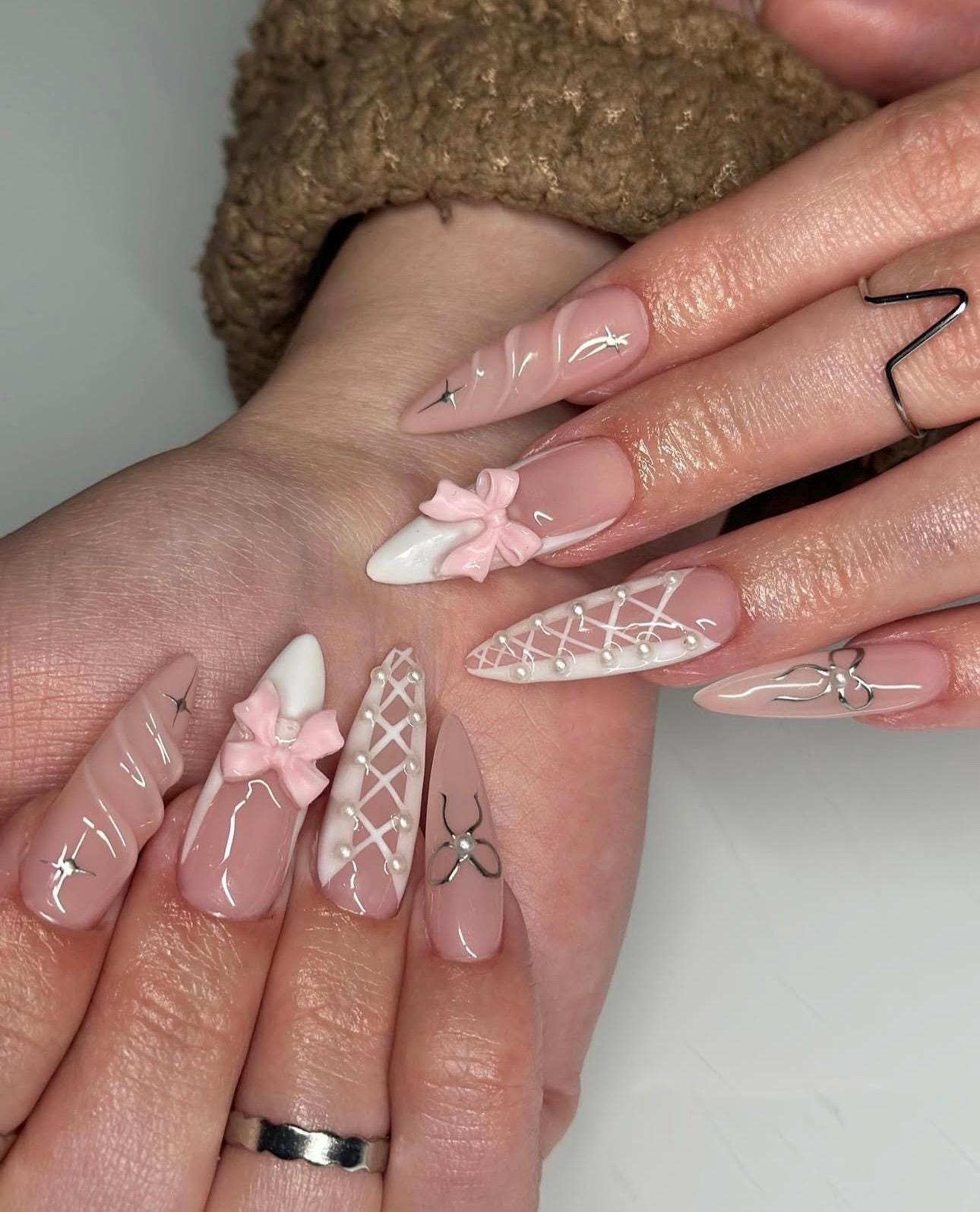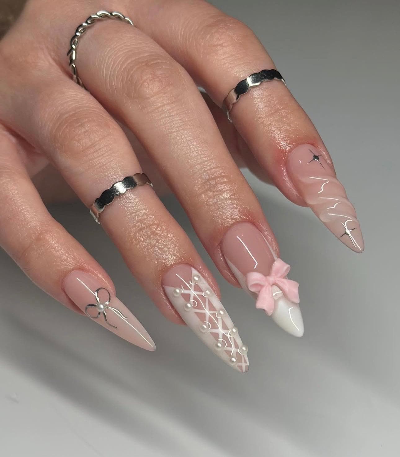 Pink Ribbon Stiletto Press On Nails: Chrome Star Y2K False Nails