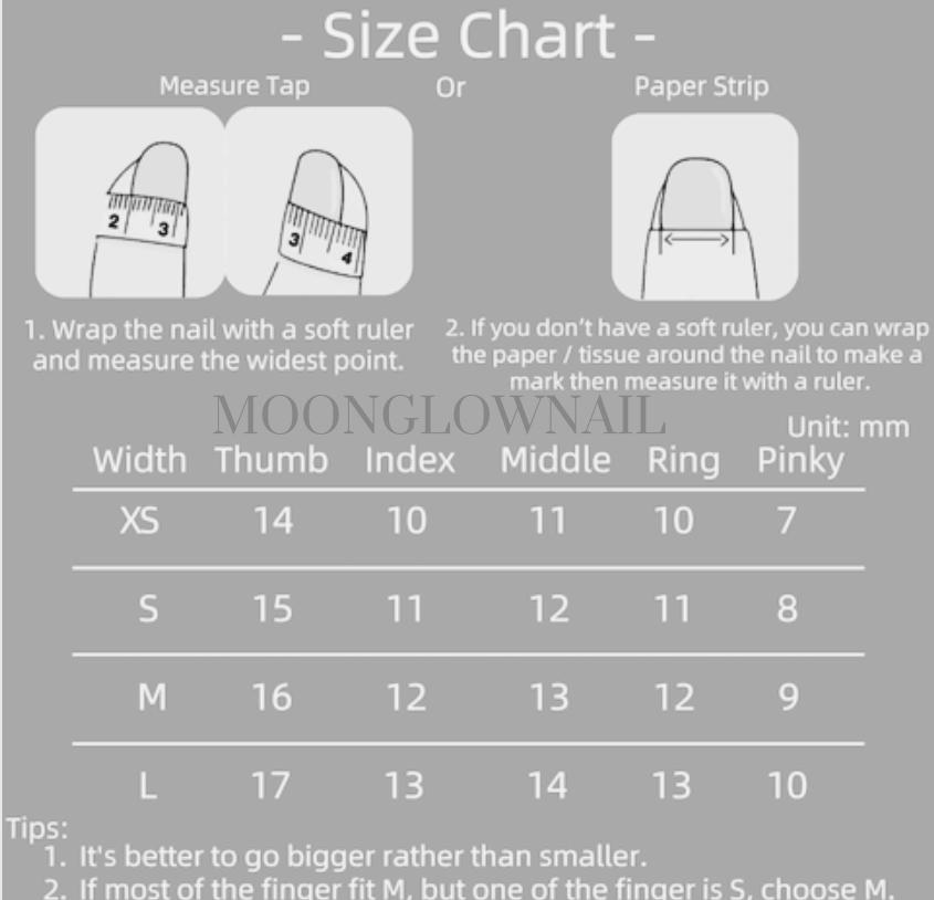Each set includes multiple sizes to ensure a perfect fit for most nail shapes. If you’re unsure, we also offer custom sizing — feel free to message us!