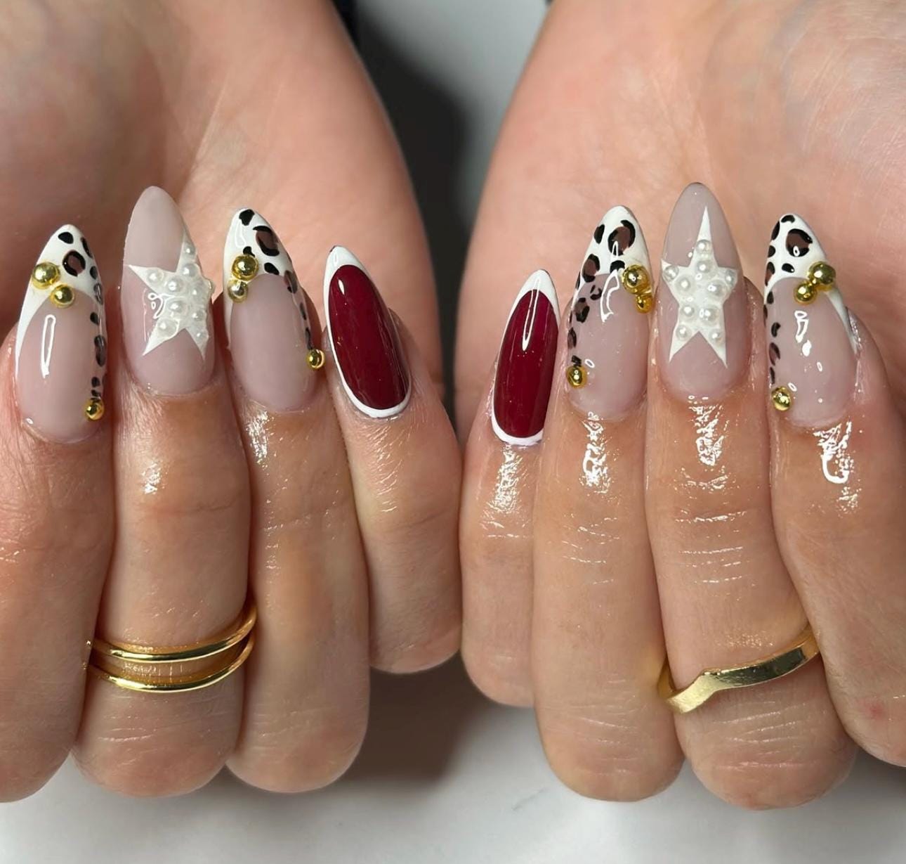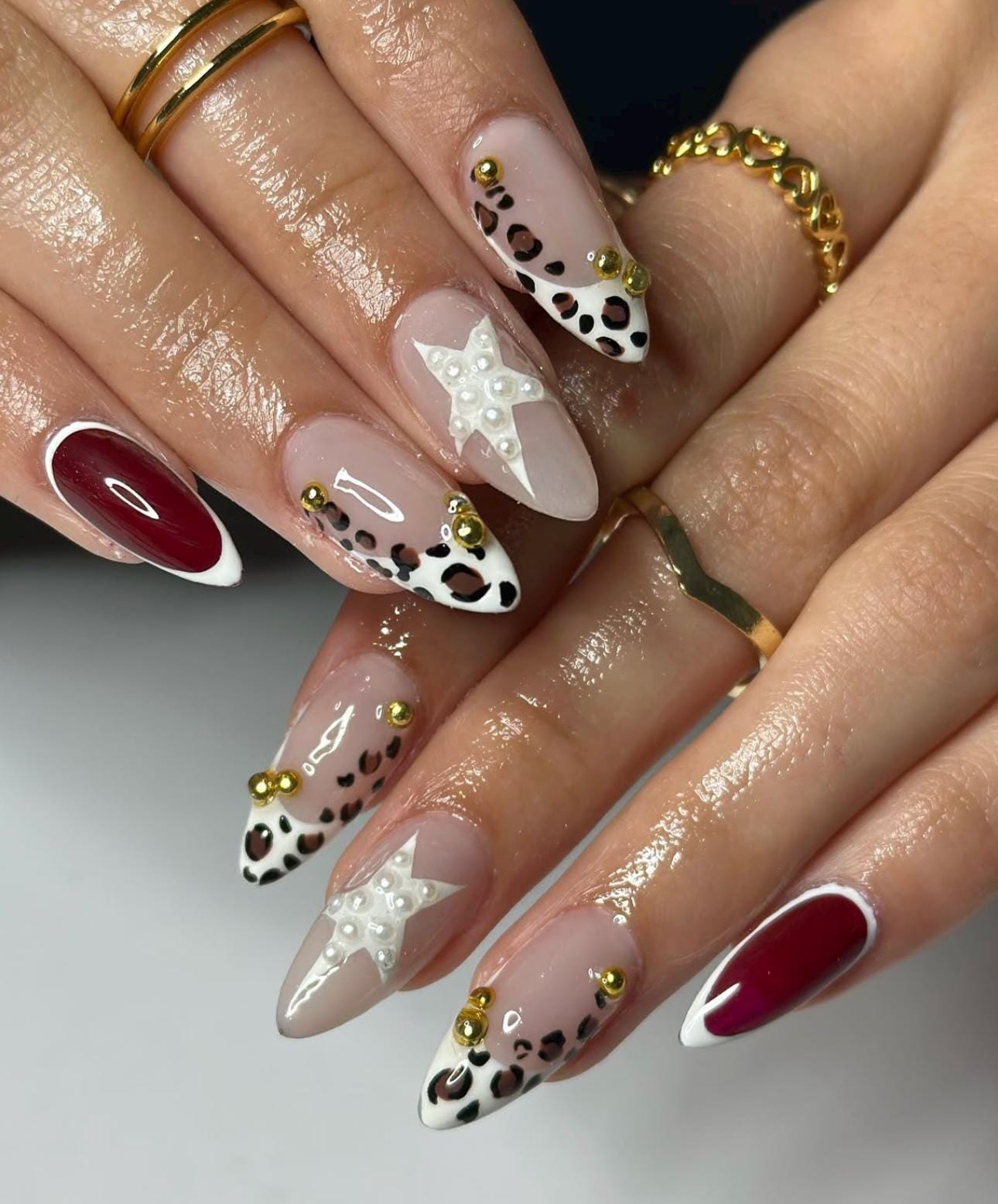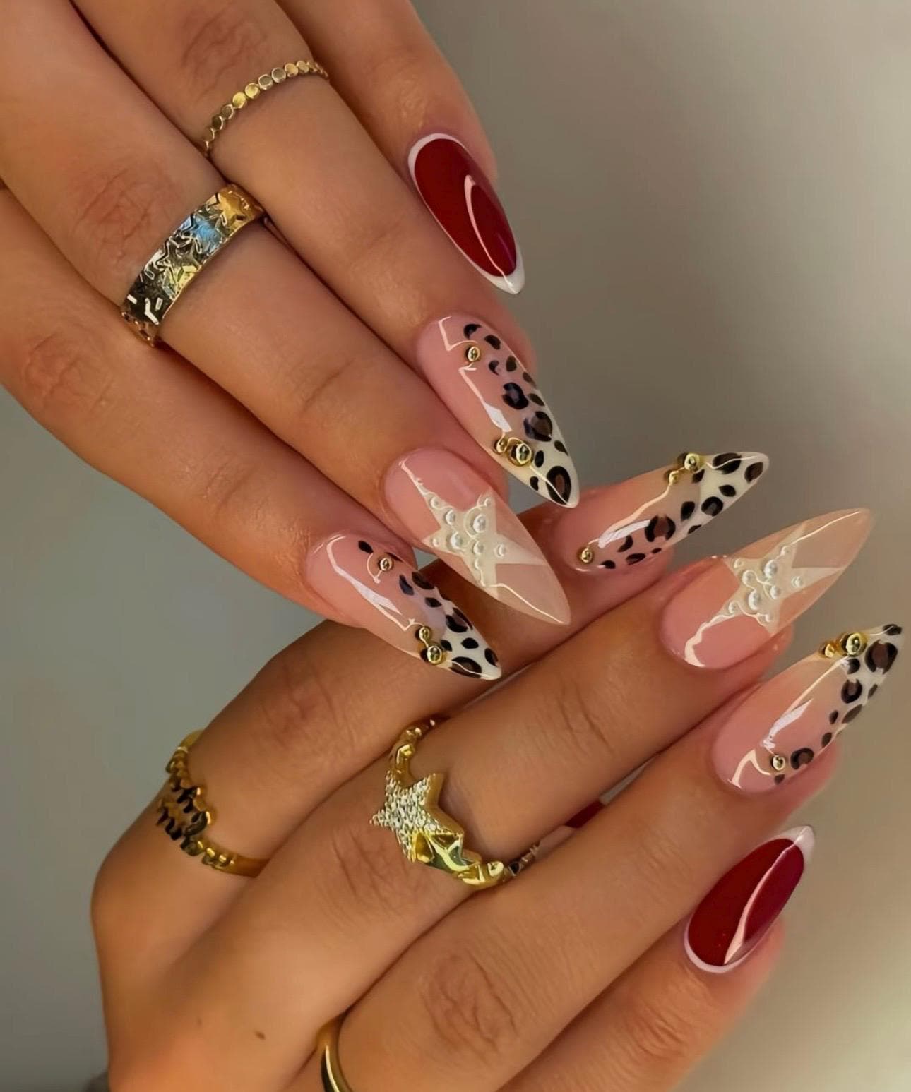 Handmade Stiletto Press On Nails: Leopard Star Flower Design