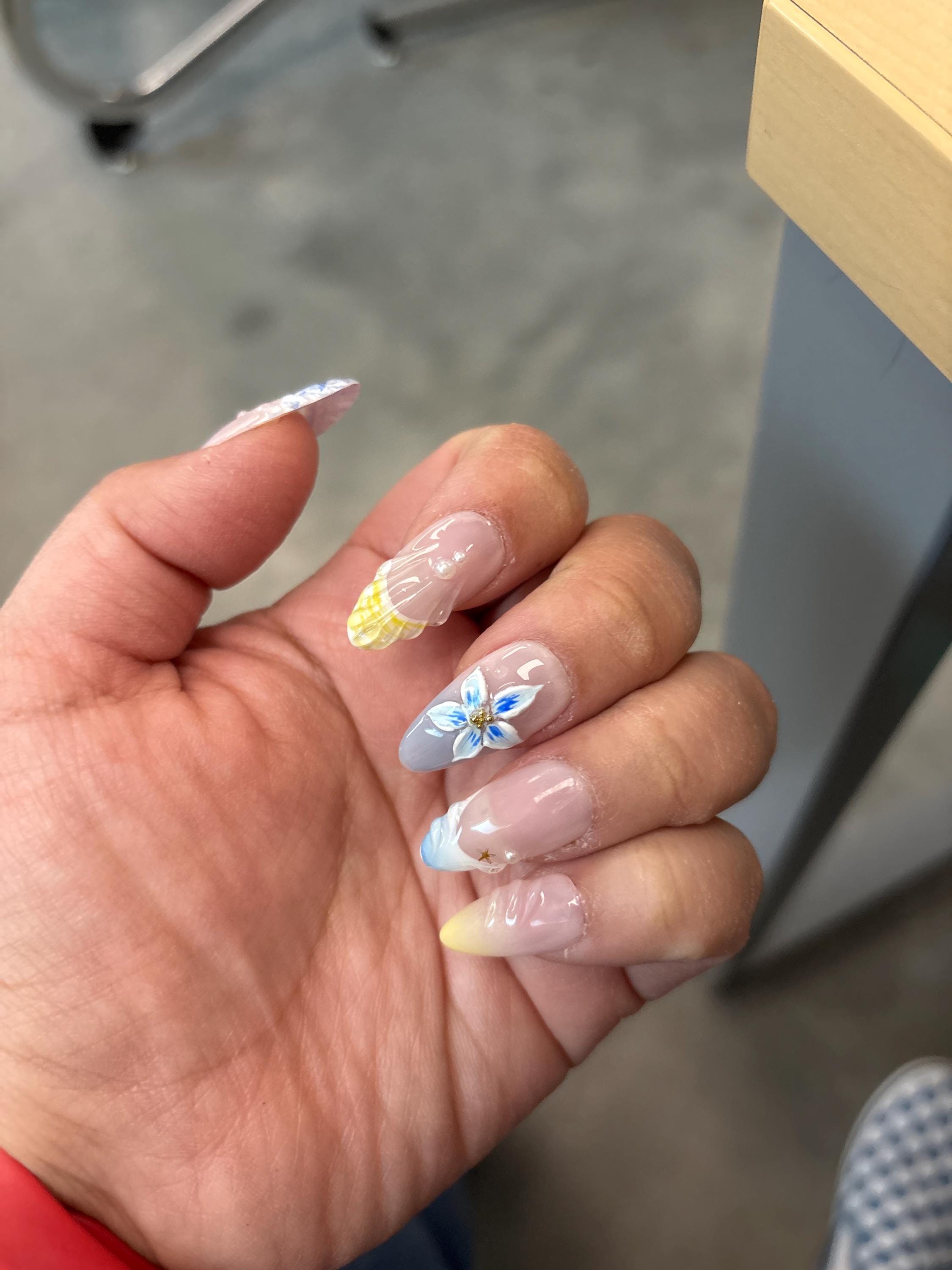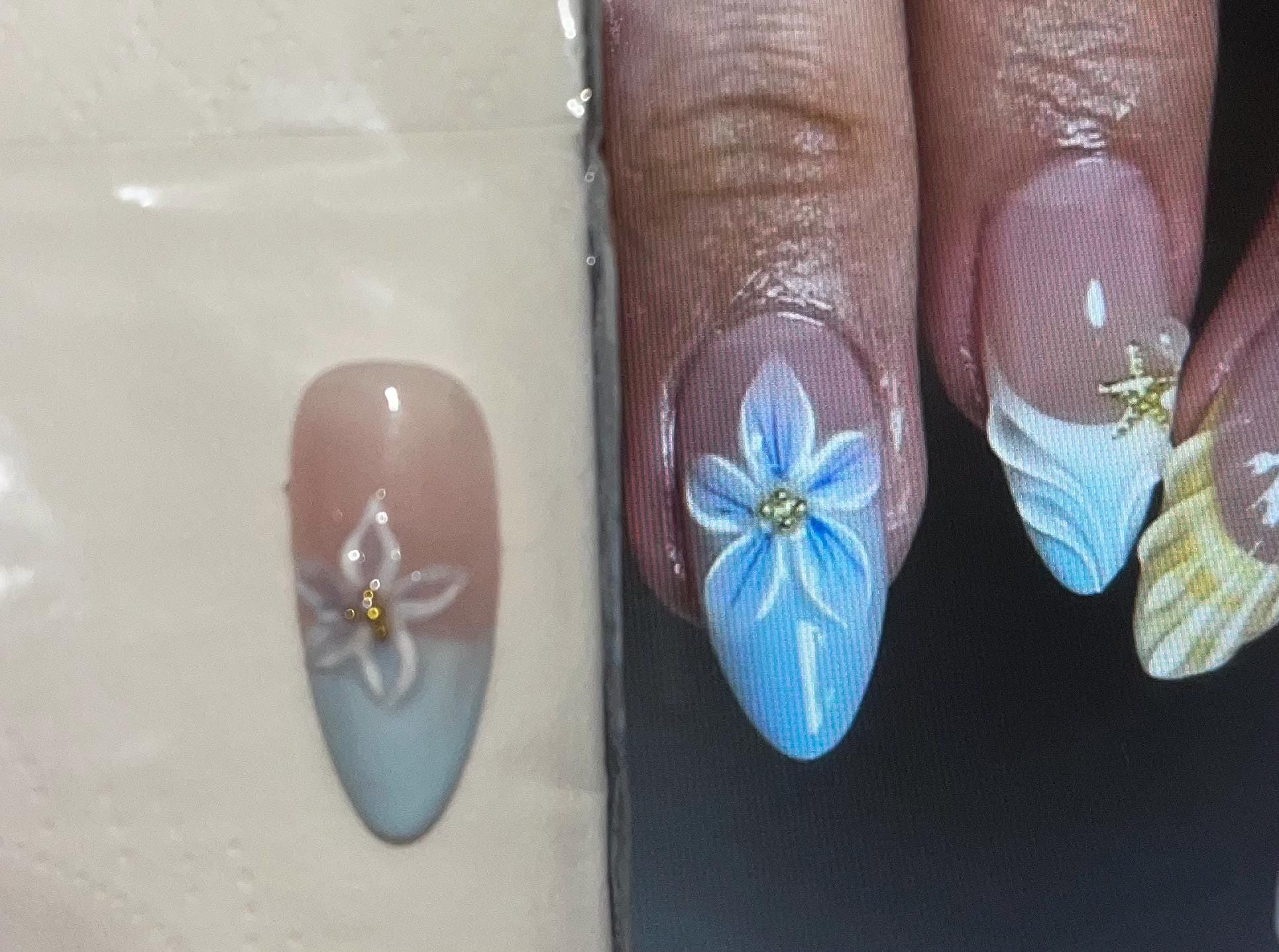 Ich habe ein Nagelset bestellt, bei dem auf dem Foto ein blauer Hintergrund mit einer großen, blauen Blume abgebildet war – die Blume erstreckt sich deutlich über den ganzen Nagel. Das, was ich erhalten habe, weicht leider stark davon ab, die Blume ist weiß statt blau, sehr klein und sitzt zudem schief und weit links – nicht mittig wie abgebildet. Das Gesamtbild ist dadurch leider nicht das, was ich bestellt habe, und entspricht für mich nicht dem Preis-Leistungs-Verhältnis.