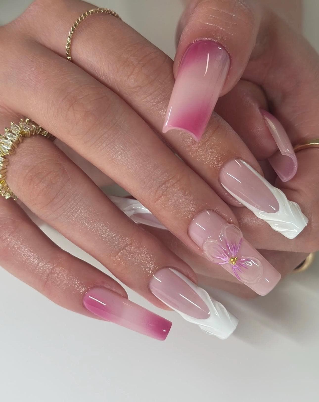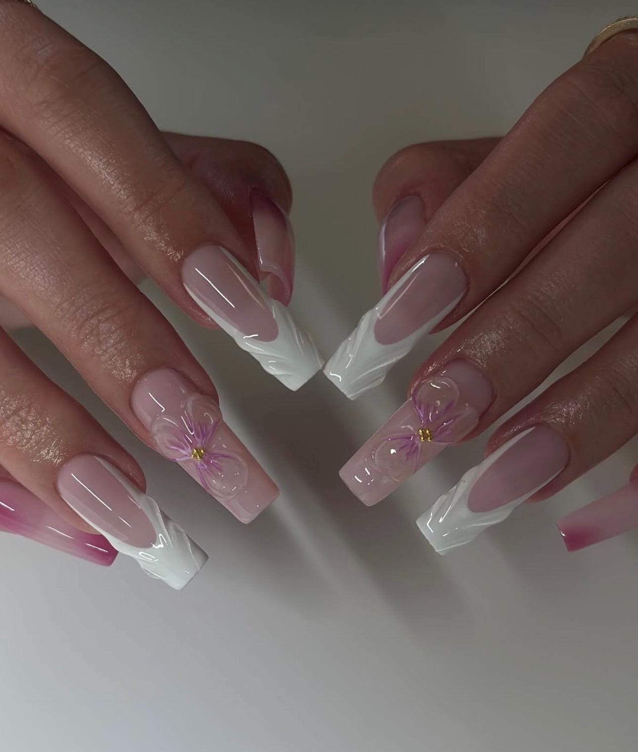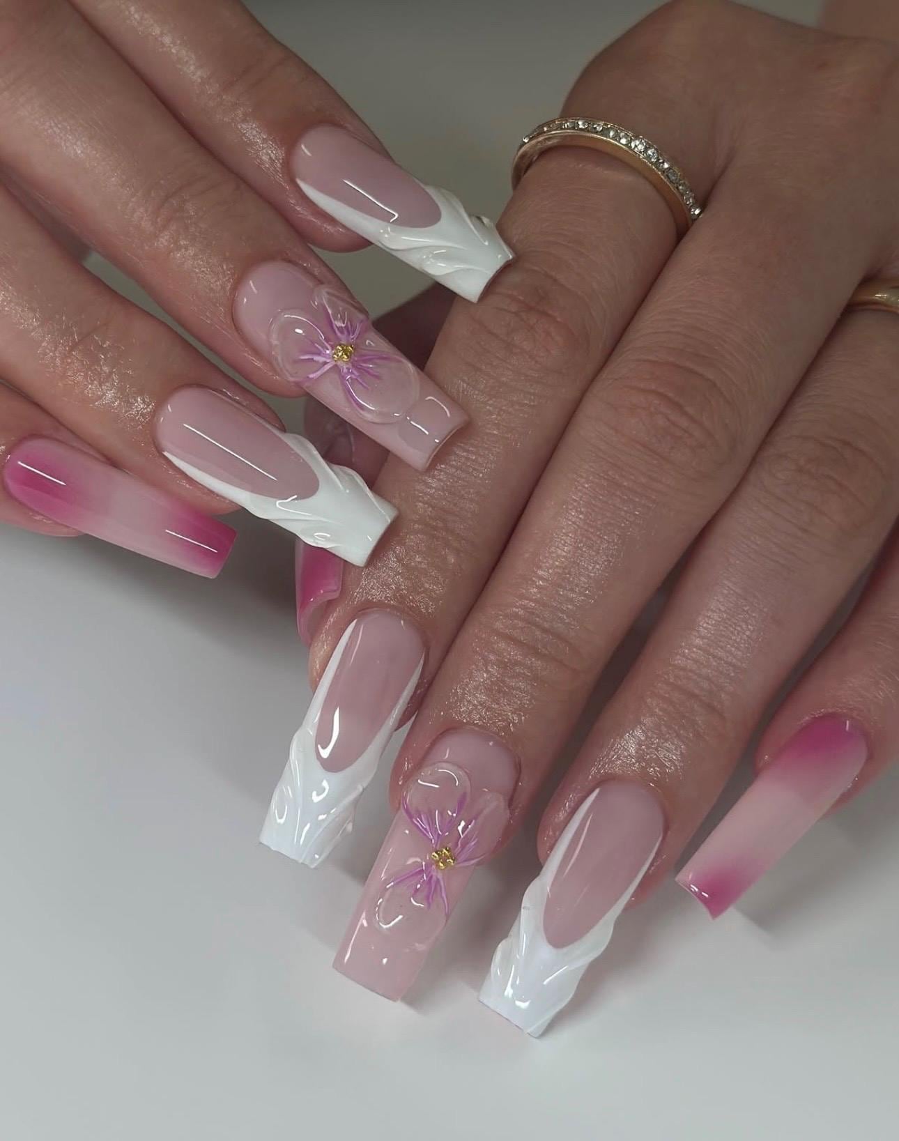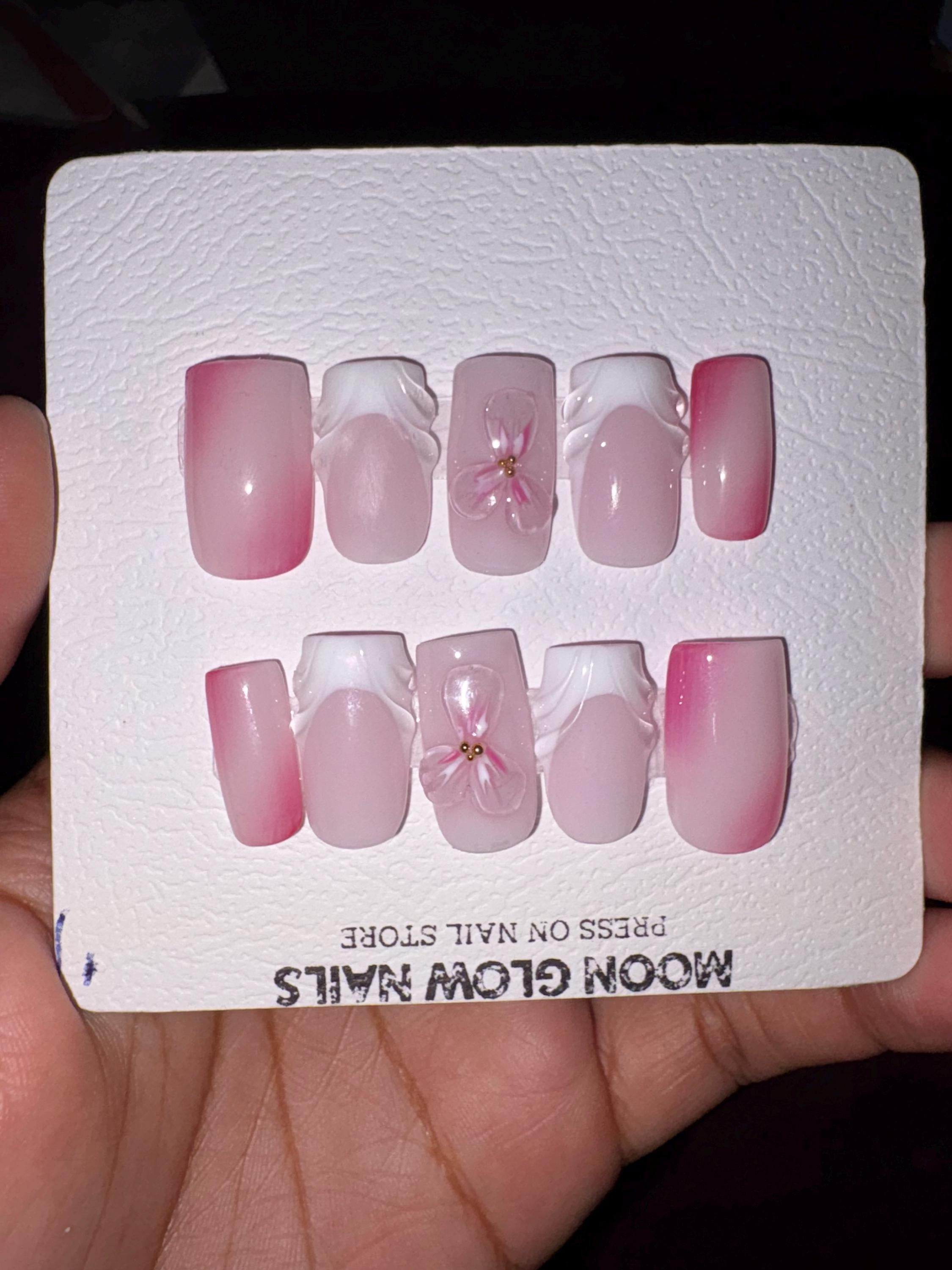 3D Flower Press On Nails: Square French Tip, Luxury Handmade Gel