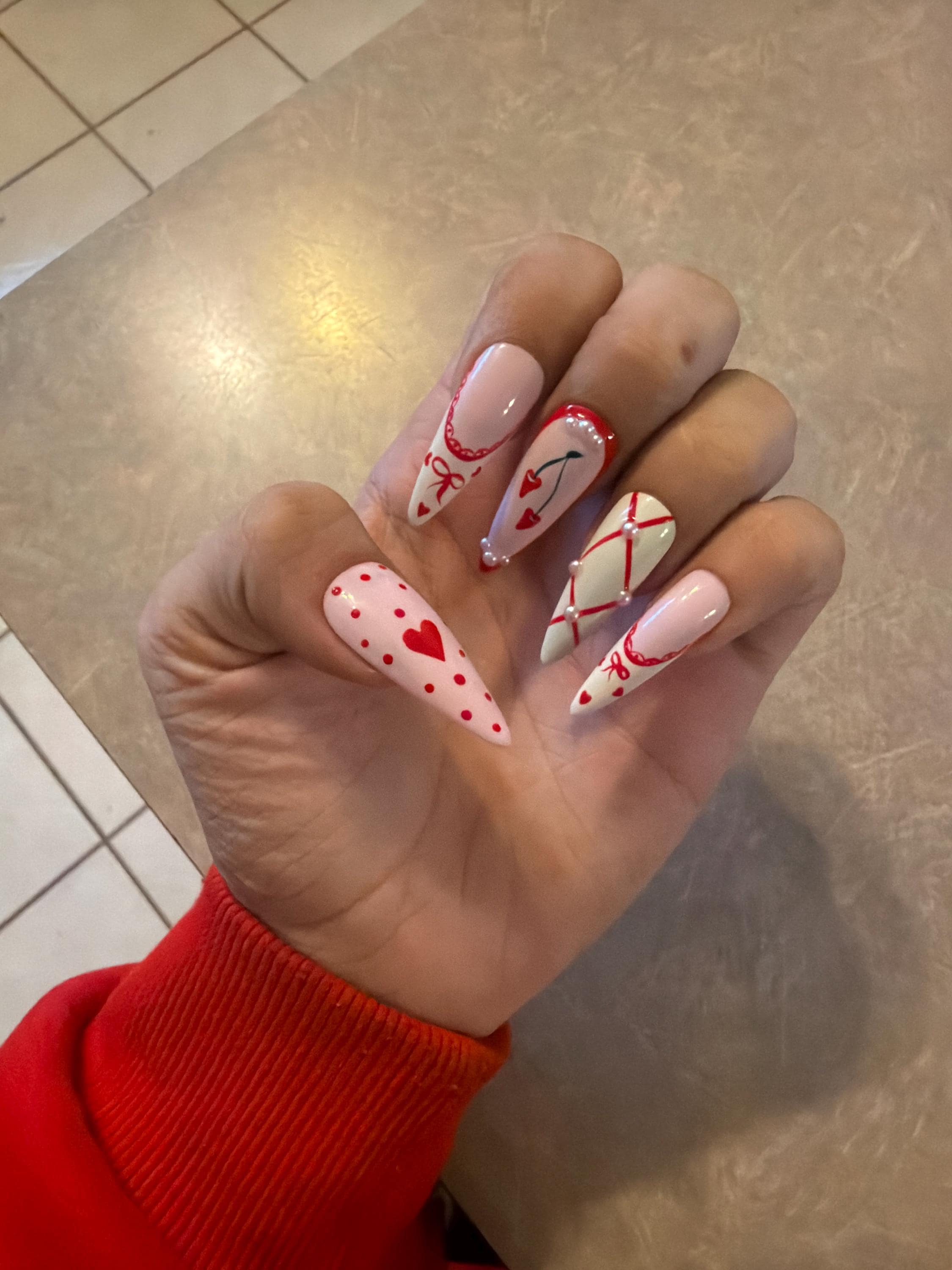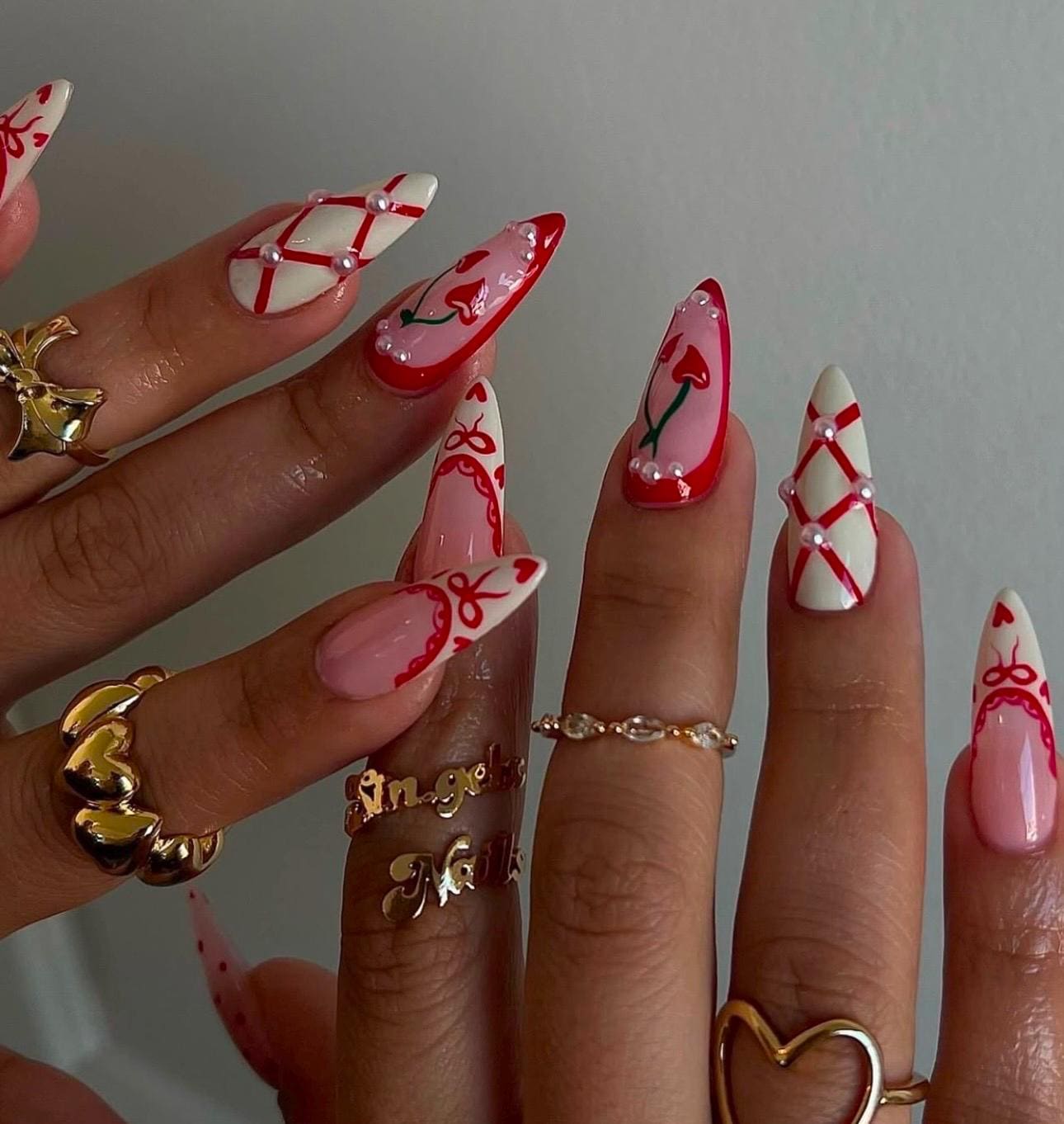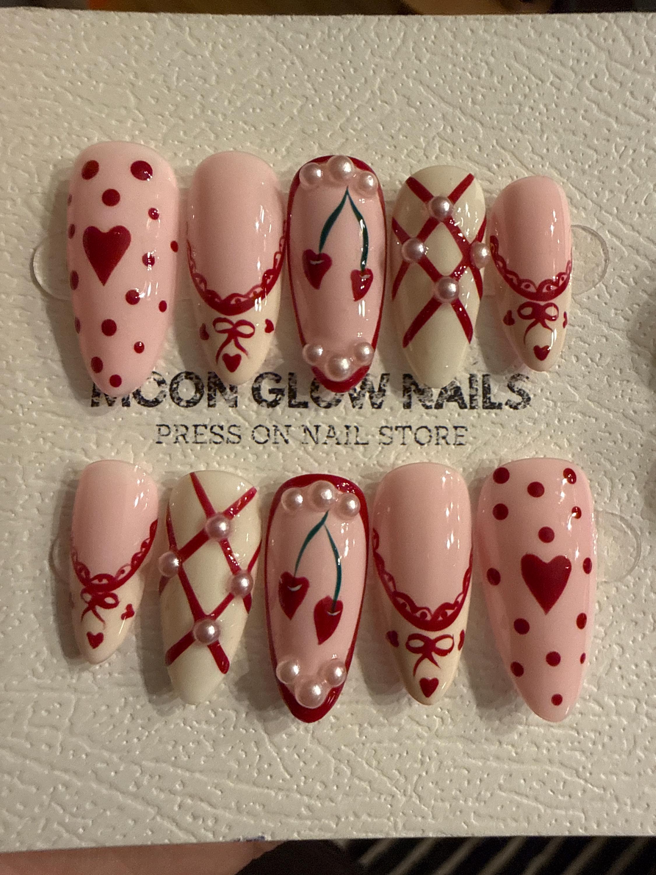 Red French Tip Press On Nails: Almond, Ribbon & Pearl