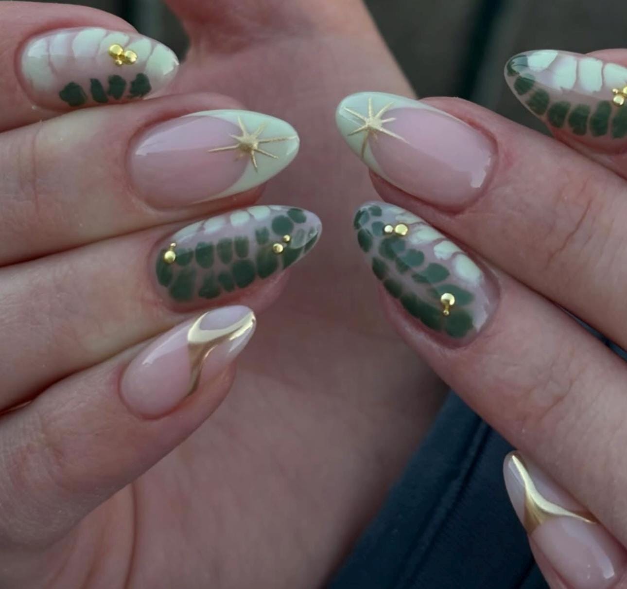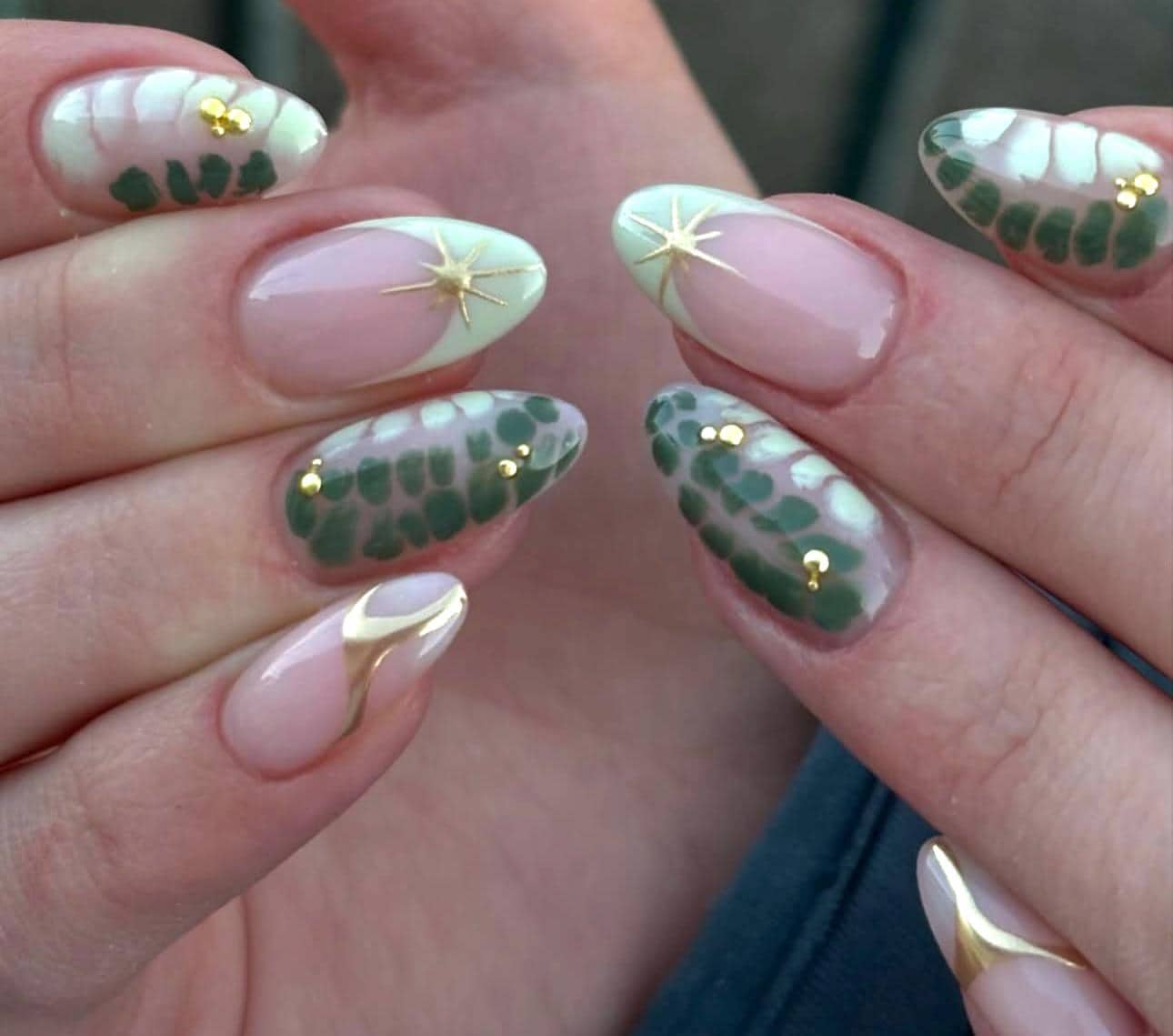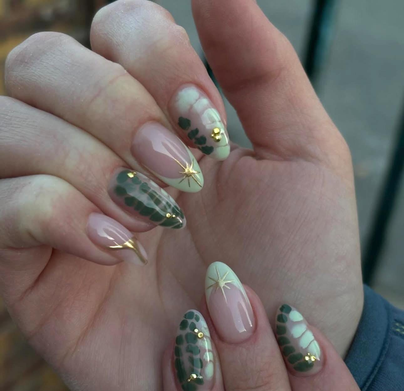 Green Blooming Press On Nails: Chrome Star French Tips, Reusable Nail Art