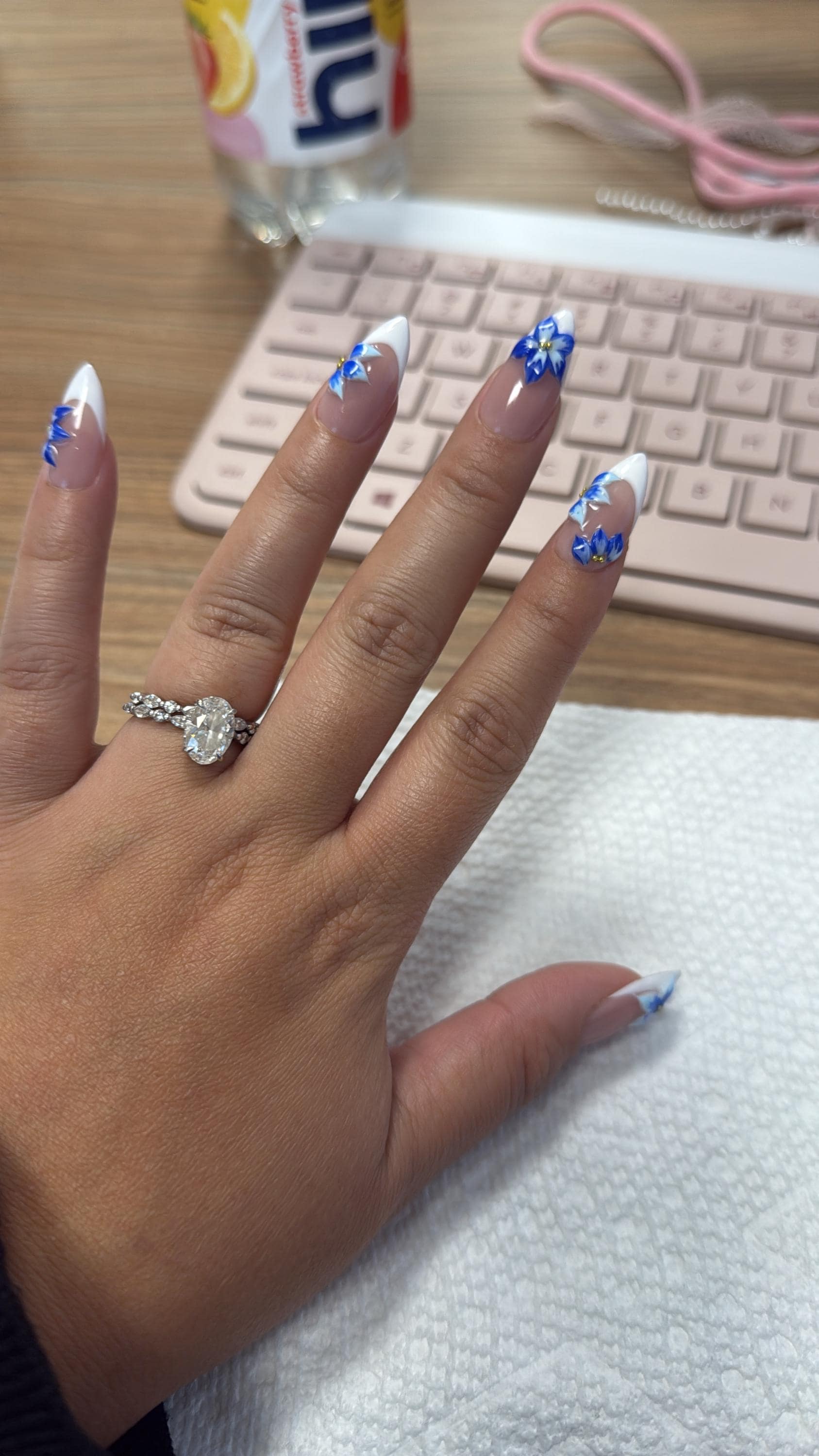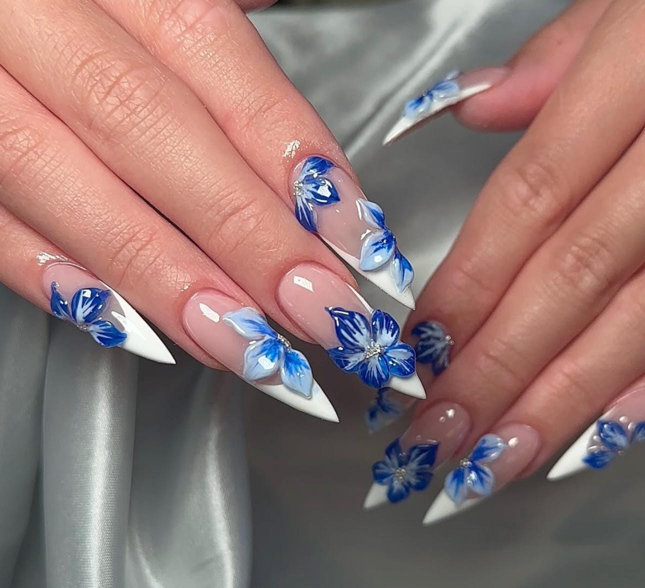 Stiletto White French Press On Nails: Blue 3D Floral, Handmade Summer False Tips