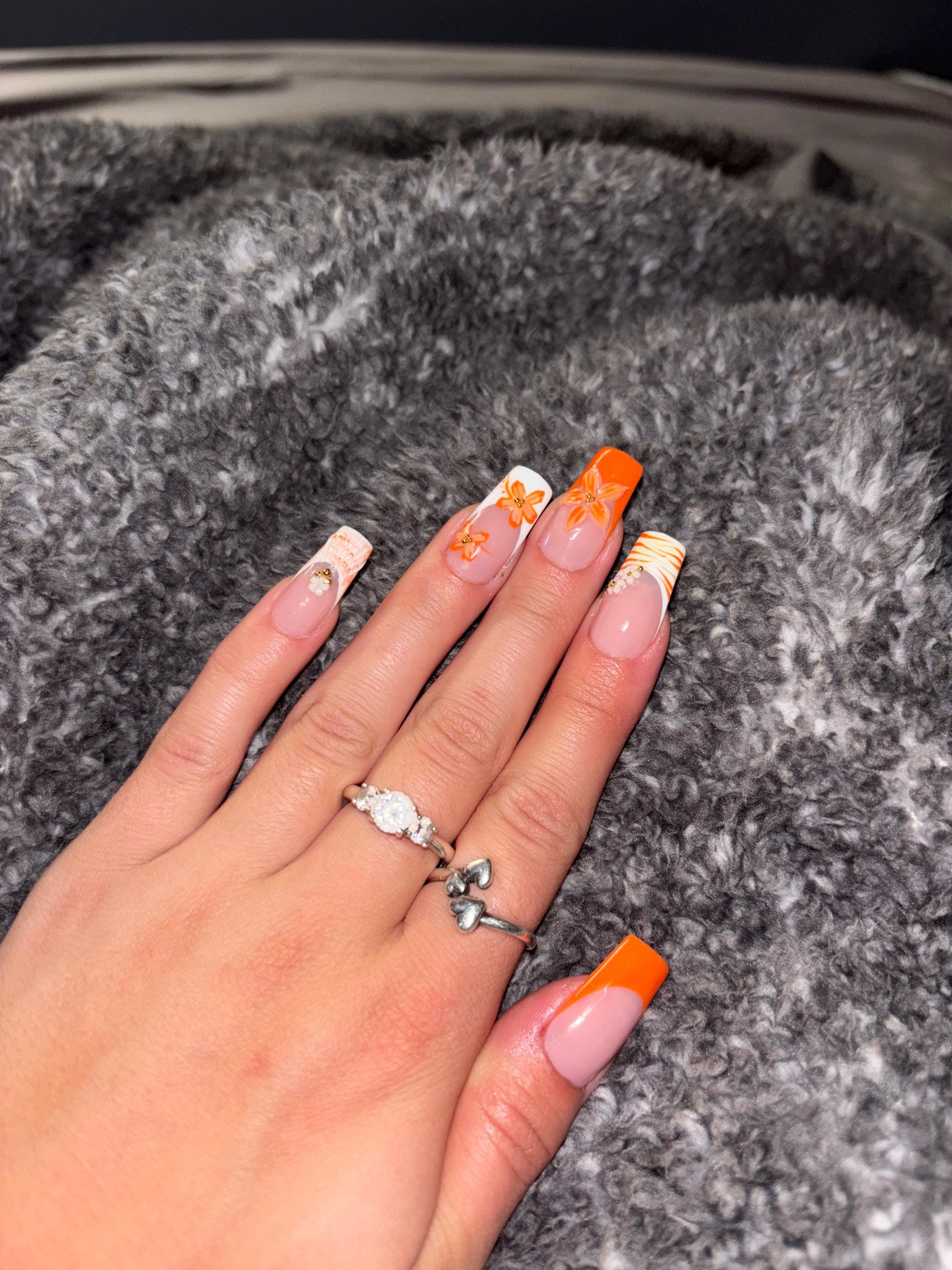 Orange French Tip Press On Nails: Zebra Flower Y2K Nail Art, Long Square Handmade Nail Set, Fake False Nails