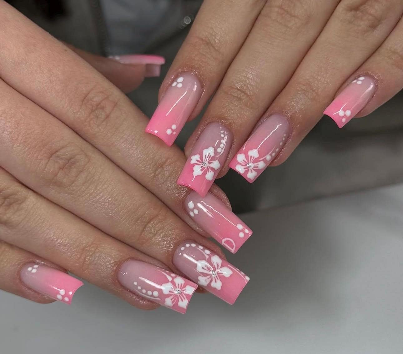 Handmade Pink Ombre Press On Nails: White Floral Nail Art