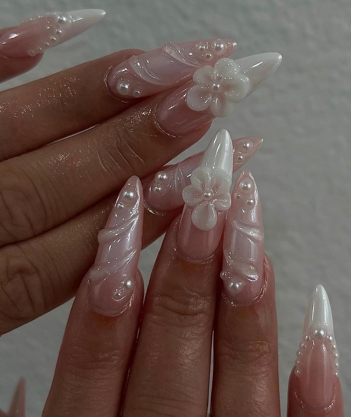 Pearl Press On Nails: Long Almond Handmade Nail Set, 3D Gel Flowers Nail Art