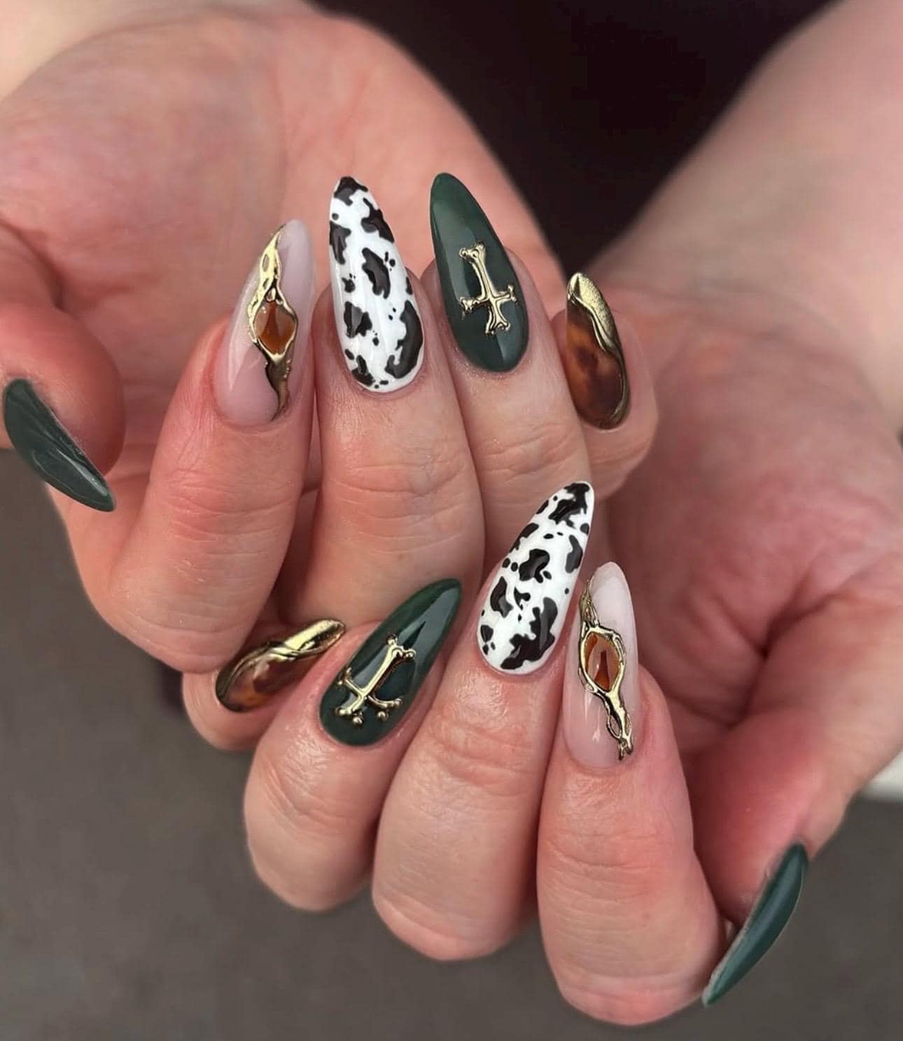 Press On Nails: Cow Print Almond Nails with Gold Chrome Cross Design
