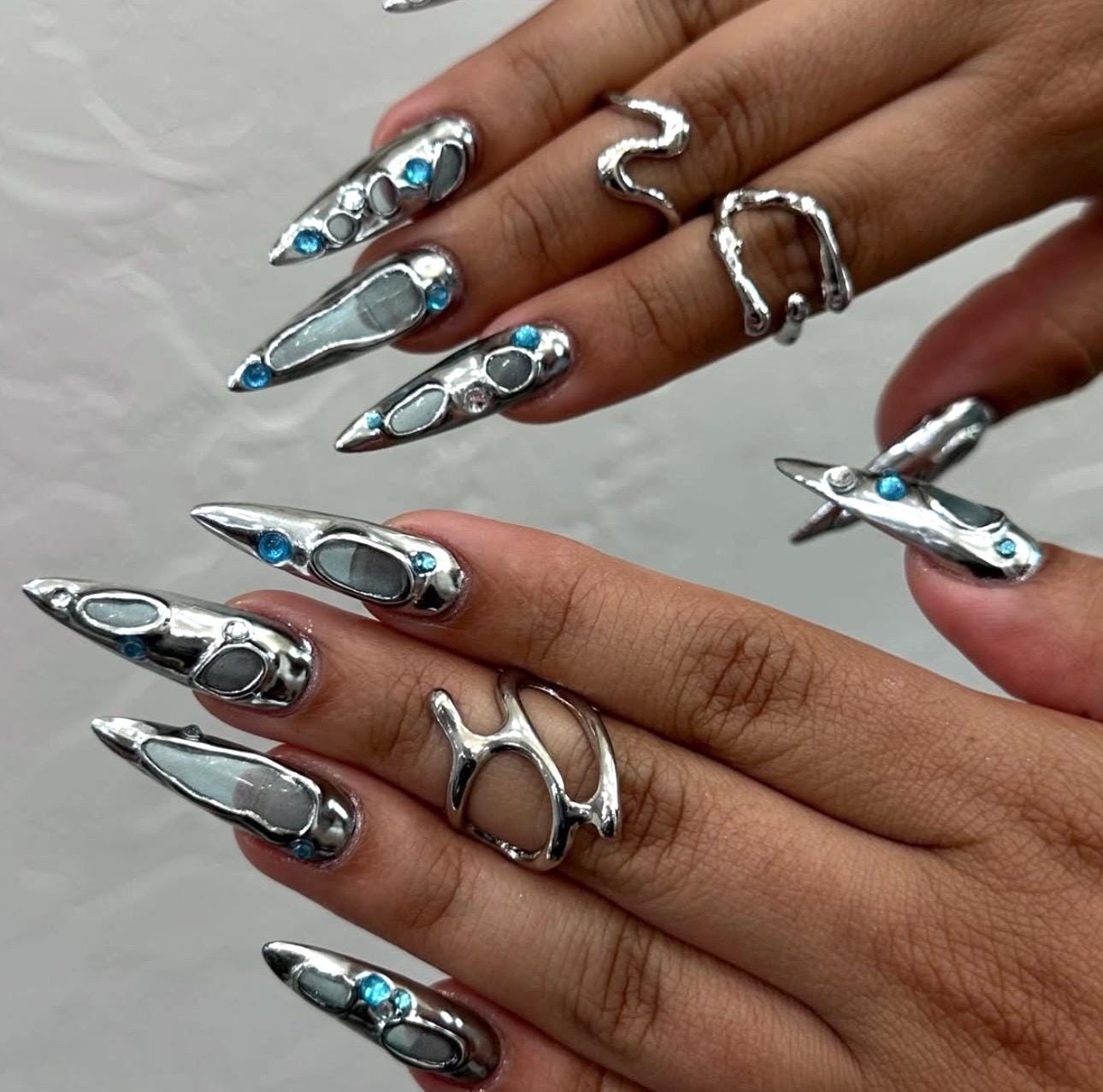 Silver Chrome 3D Gel, Long Stiletto Handmade Press On Nails