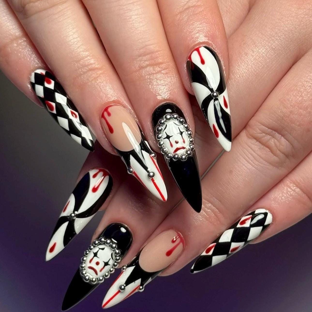Halloween Clown Nails | Long Stiletto Black White Red Gothic Press On Nails