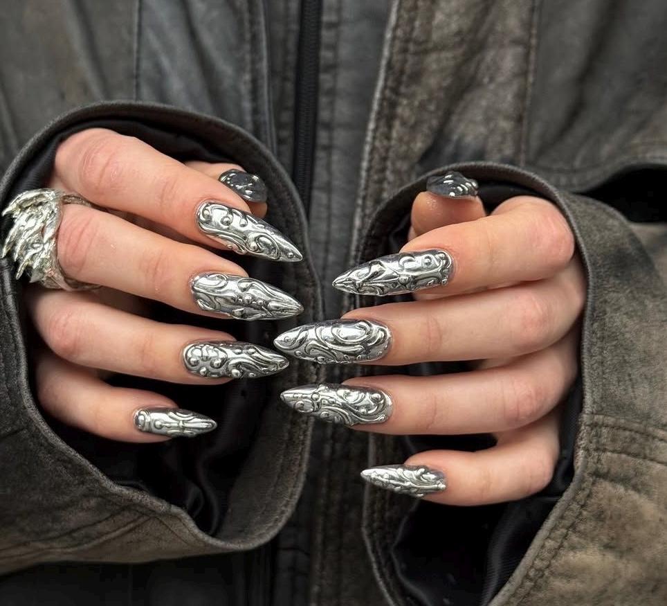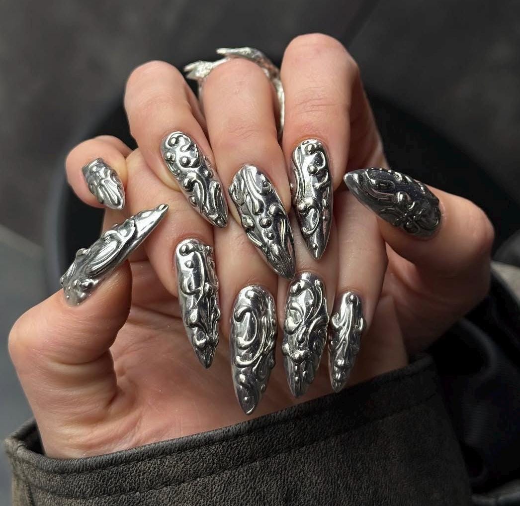 Full Silver Chrome Nails with 3D Embossed Designs | Long Almond Gothic Y2K Press On Nails