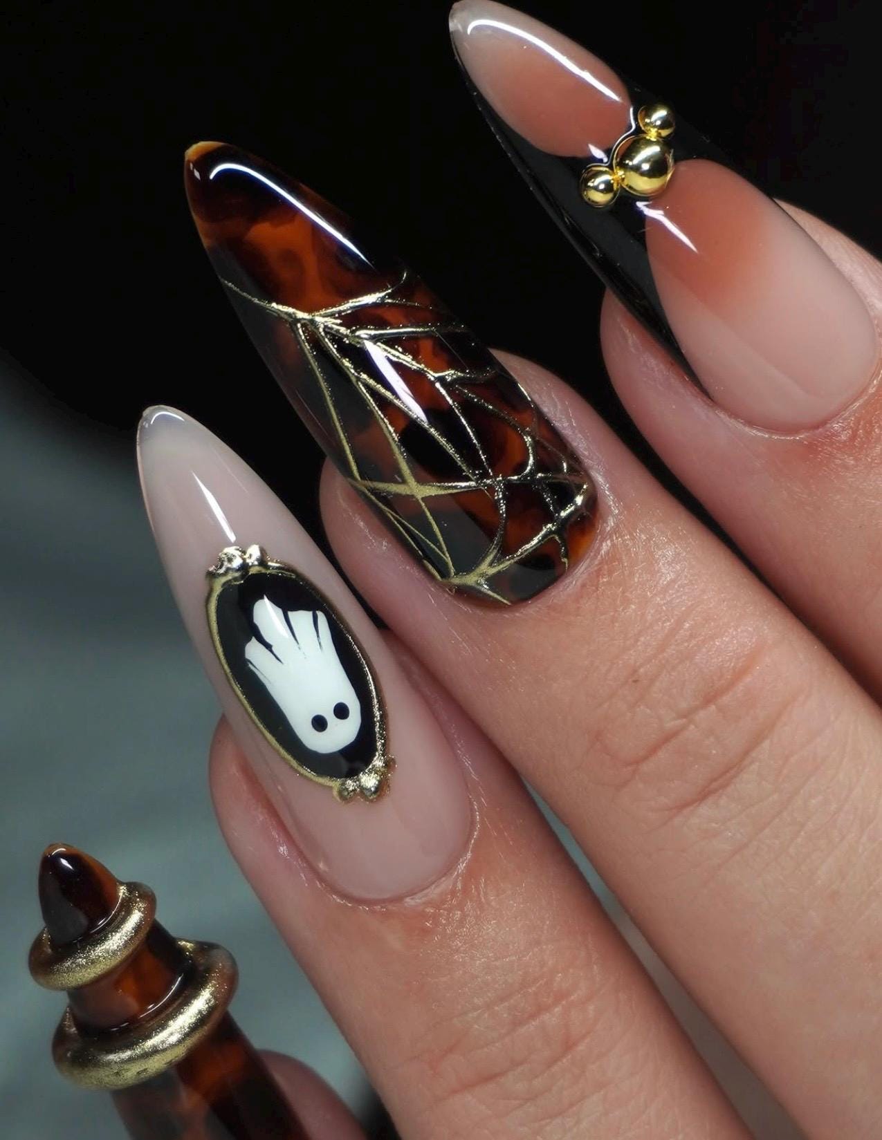 Brown Ombre Halloween Nails with Ghost & Gold Chrome | Long Almond Fall Press On Nails | Handmade Acrylic False Nails