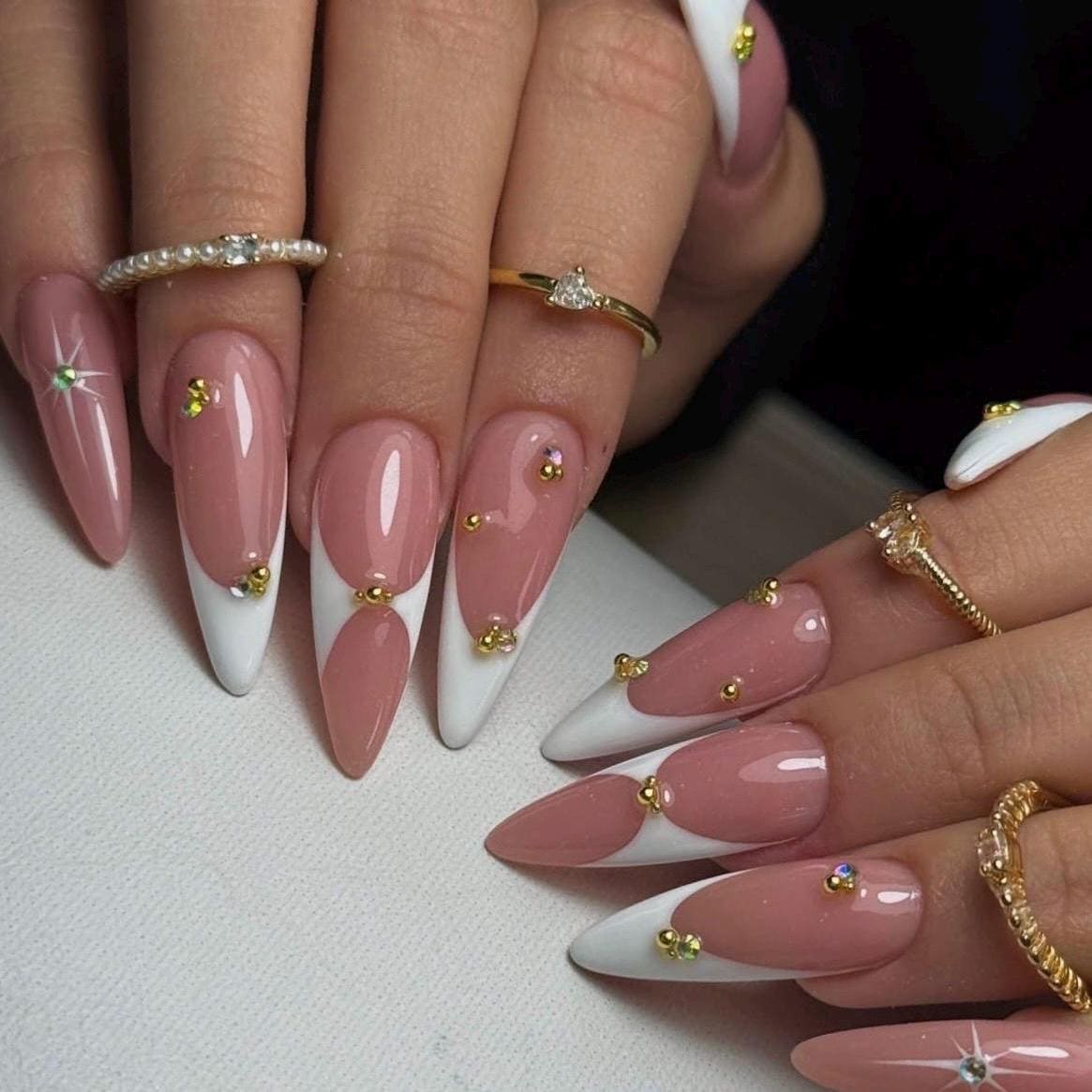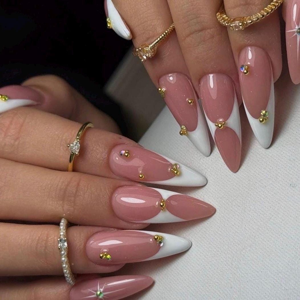 Bring timeless elegance to your fingertips with this Luxury Nude French Press On Nail Set. Featuring almond-shaped tips, white French edges, and delicate gold rhinestones, this set perfectly blends minimal elegance with festive sparkle.