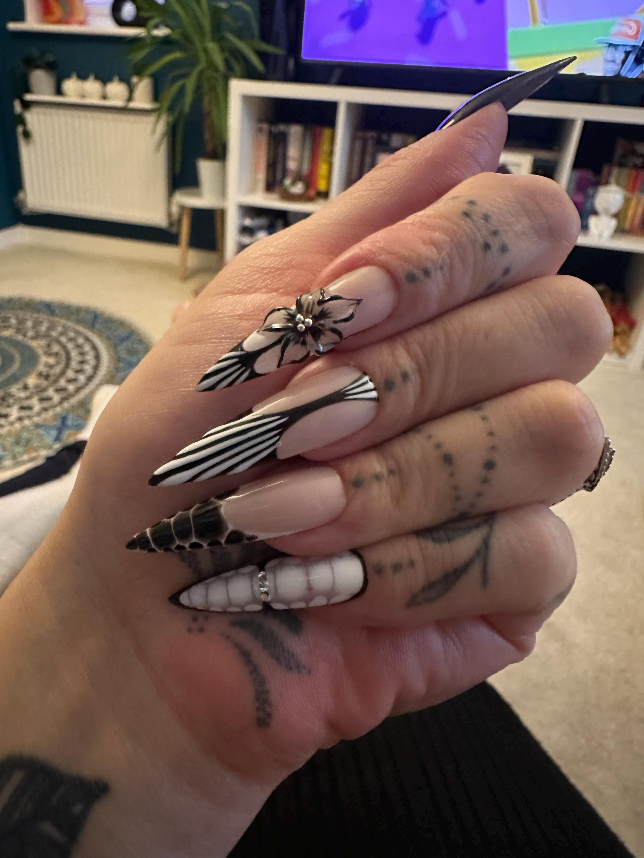 Make an unforgettable statement with this Luxury Black & White Press On Nail Set. Featuring intricate 3D flower art, textured monochrome designs, and elongated stiletto tips, this set brings a bold yet refined edge to any look.