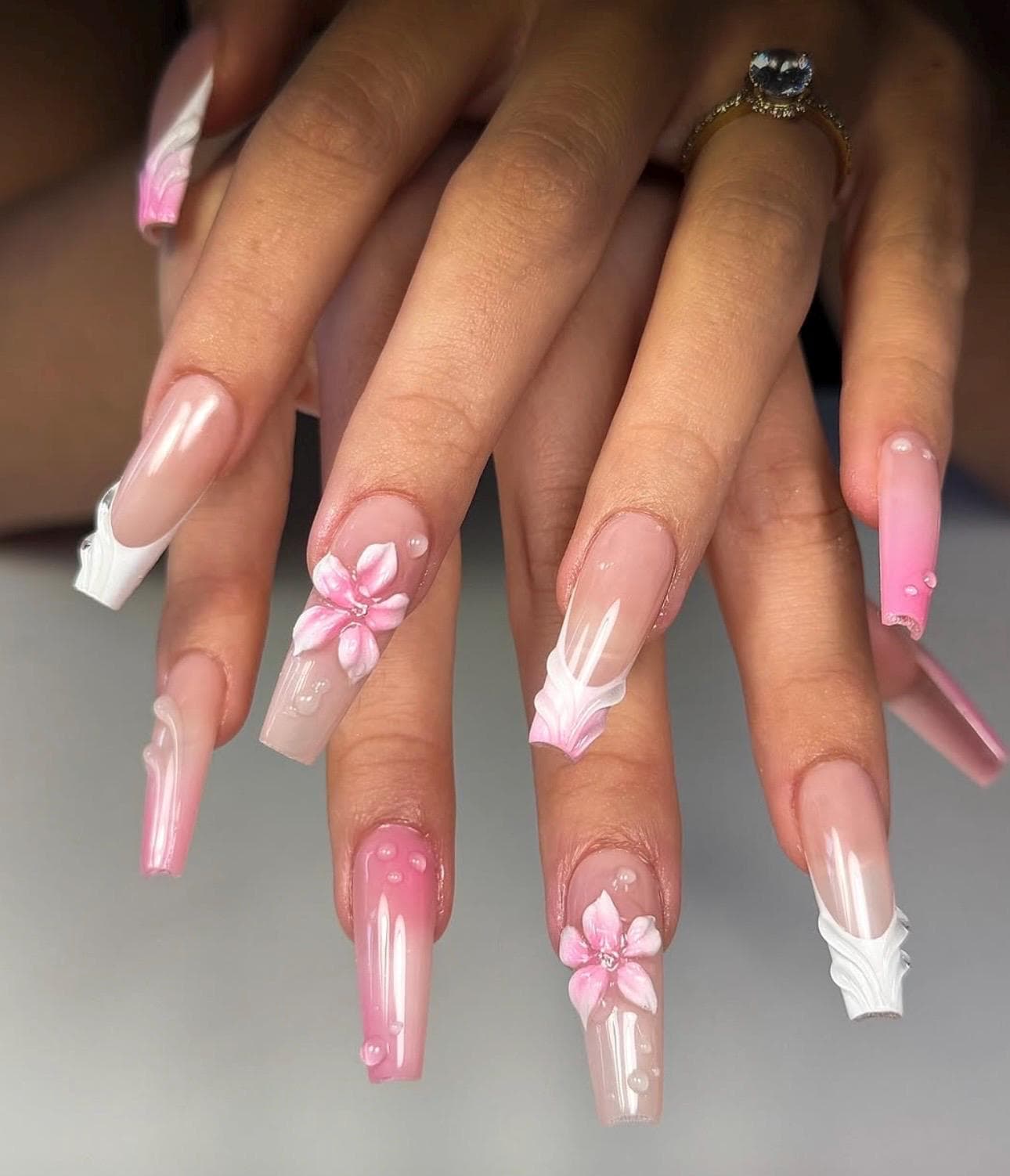 Featuring delicate hand-sculpted flowers, glossy ombré pink tones, and pearl accents, this long square nail set captures a timeless, feminine look.