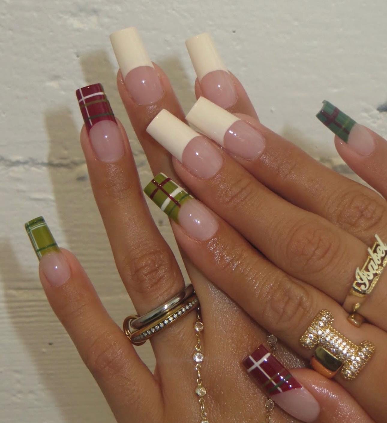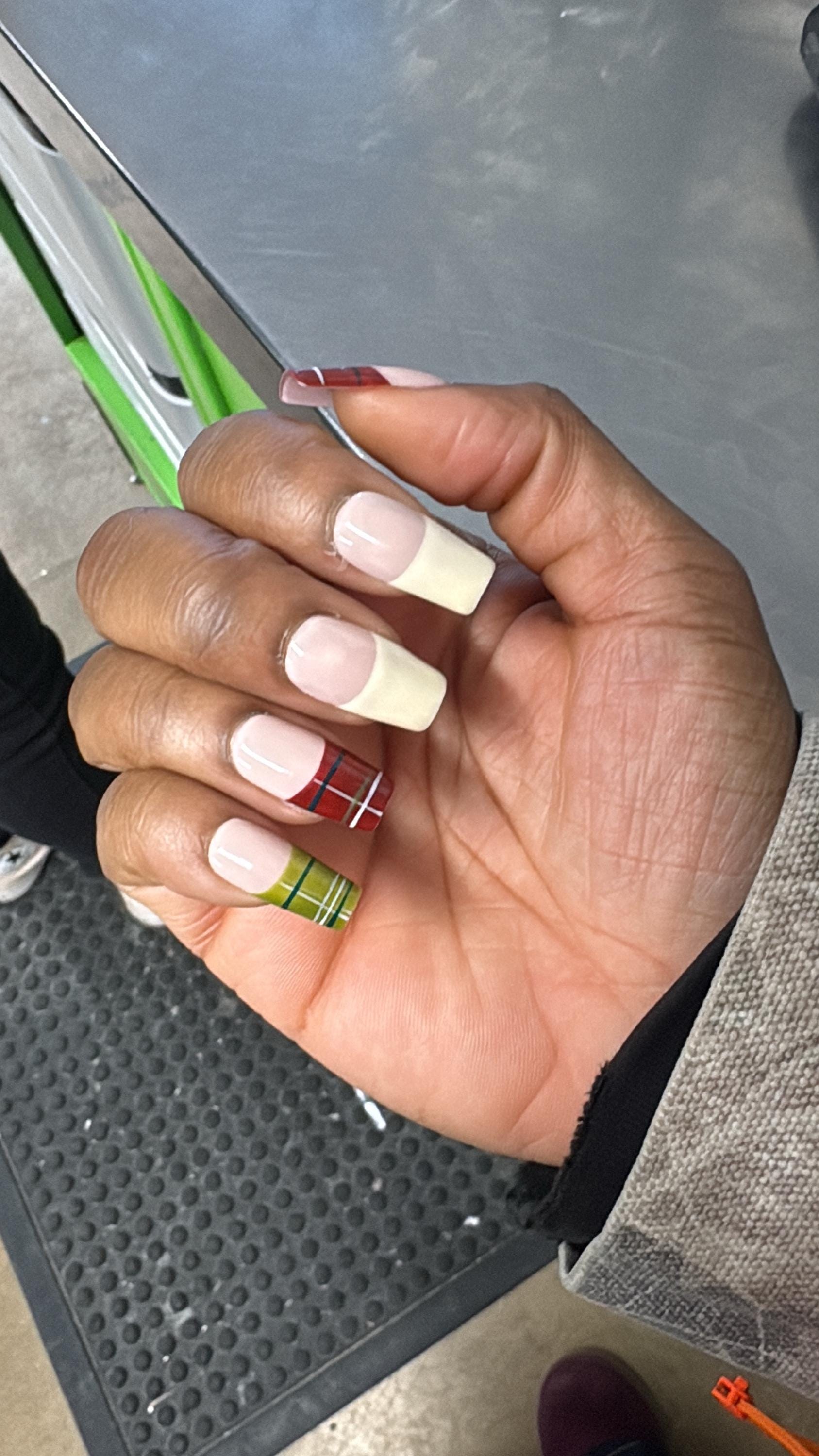 Featuring elegant cream bases paired with red and green plaid tips, this square-shaped nail set gives you the perfect mix of cozy winter vibes and modern sophistication.