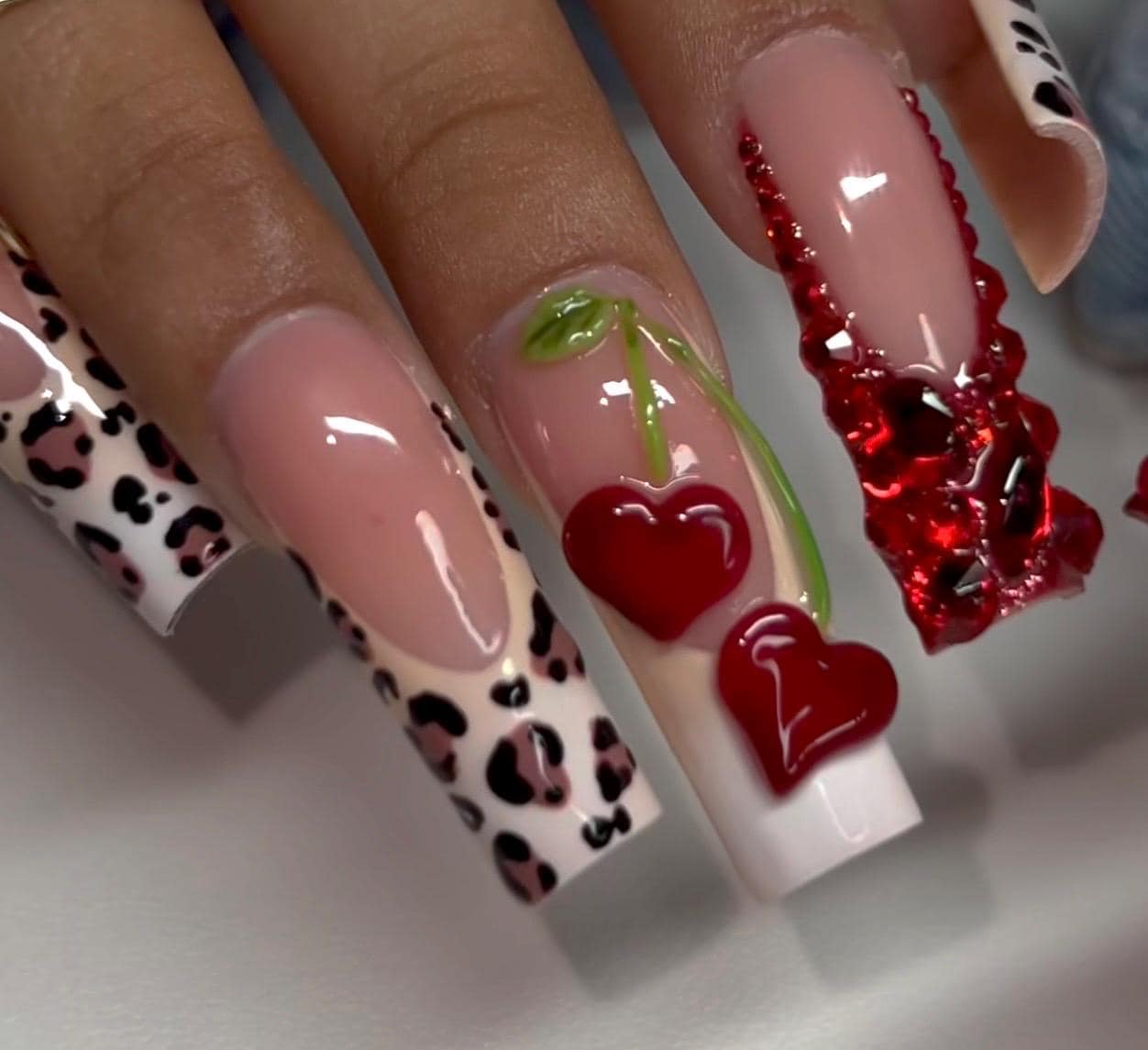 This design features bold red 3D cherry heart details combined with soft nude-pink bases and trendy leopard patterns — the ultimate ultra-popular Y2K Valentine’s aesthetic.