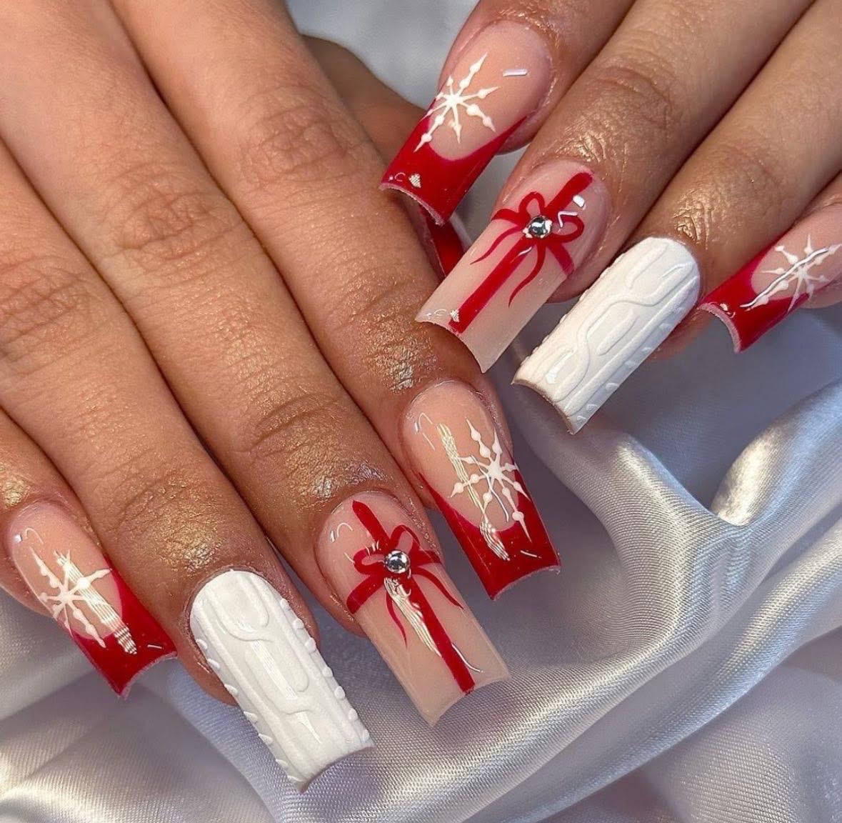 This stunning Christmas design features bright red French tips, crisp white sweater-texture accents, 3D bow details, and delicate snowflake art — the perfect festive look for holiday parties, cozy winter photoshoots, or Christmas morning glamour.
