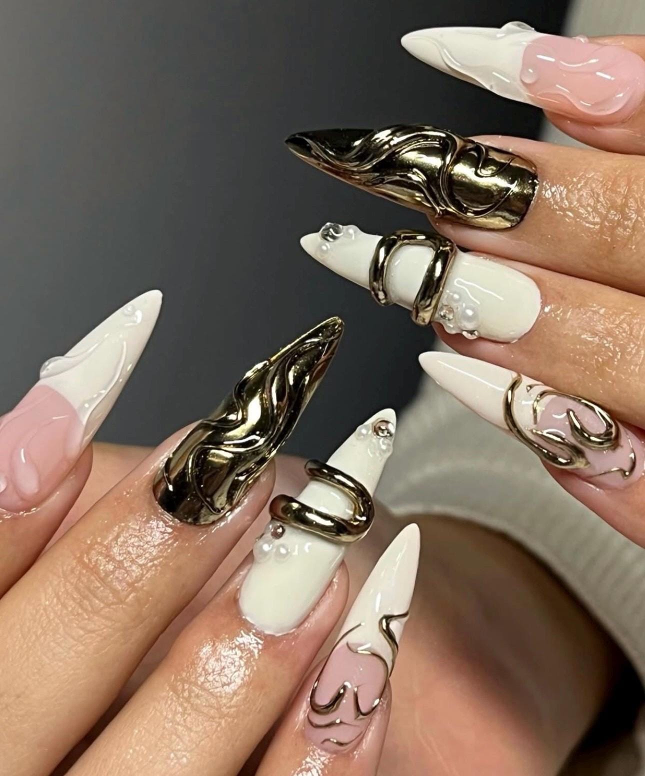 These luxury handmade press on nails feature an elegant nude pink and ivory base, elevated with bold 3D sculpted gold chrome metal details.