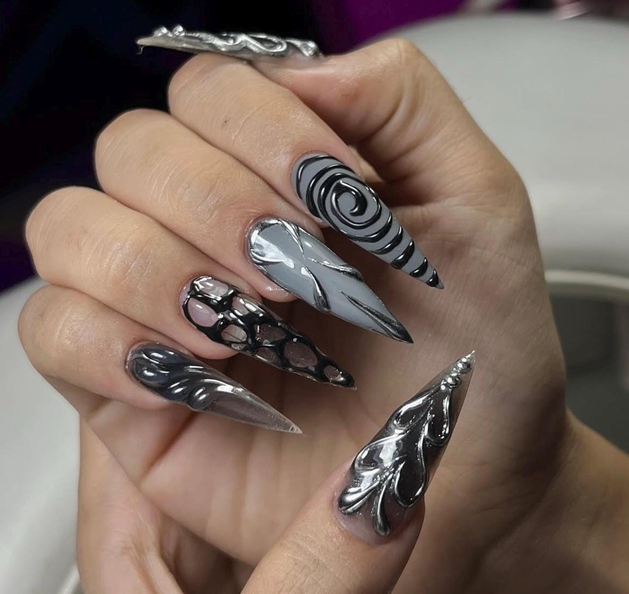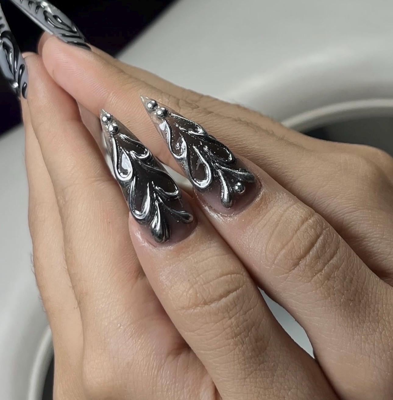 Designed for those who love statement nails, this set combines modern sculptural art with an elegant, edgy finish. Each nail is carefully handcrafted using premium gel products to ensure durability, shine, and a flawless fit.