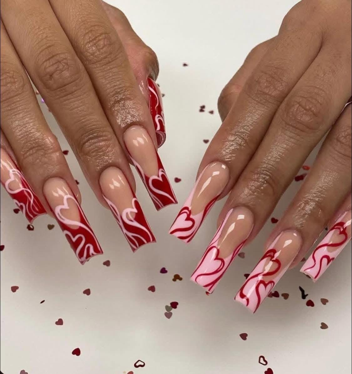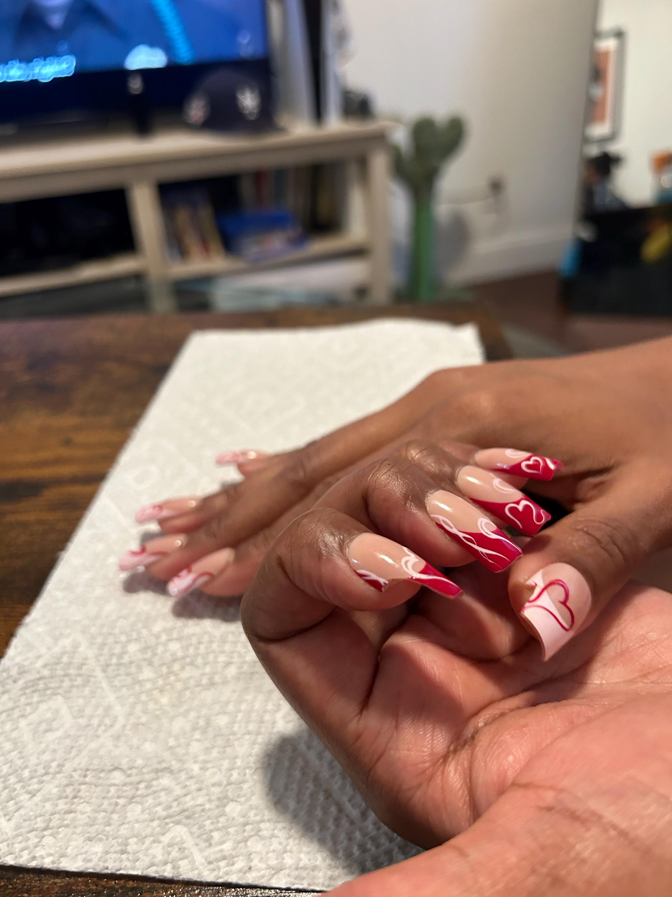 These Valentine’s Day inspired press on nails feature a soft nude base with red & pink heart french tips, creating the perfect balance between romantic, feminine, and eye-catching.