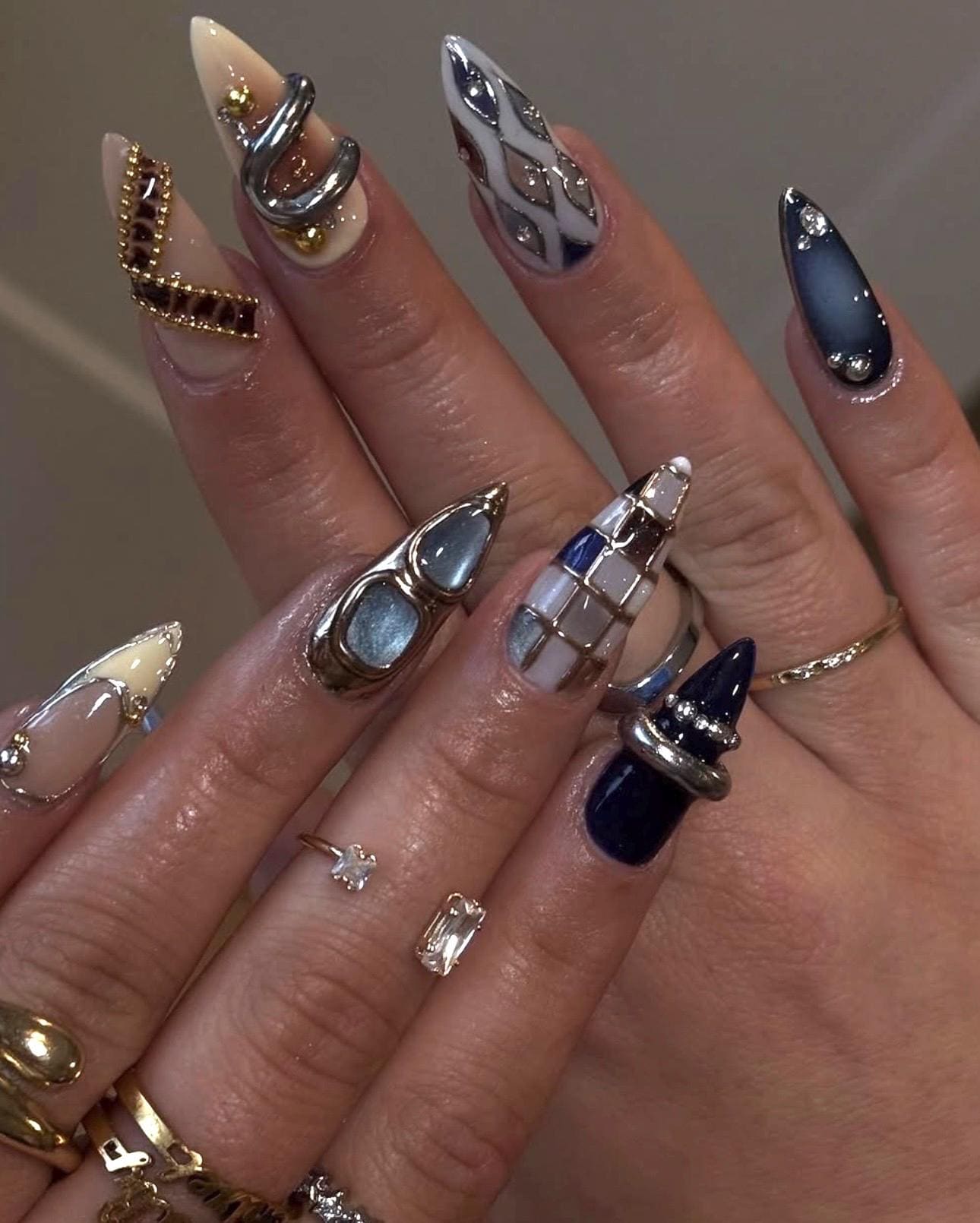 Designed for confident, fashion-forward women, this set features silver chrome accents, navy blue tones, sculptural details, and high-shine finishes inspired by designer aesthetics and Y2K luxury trends.