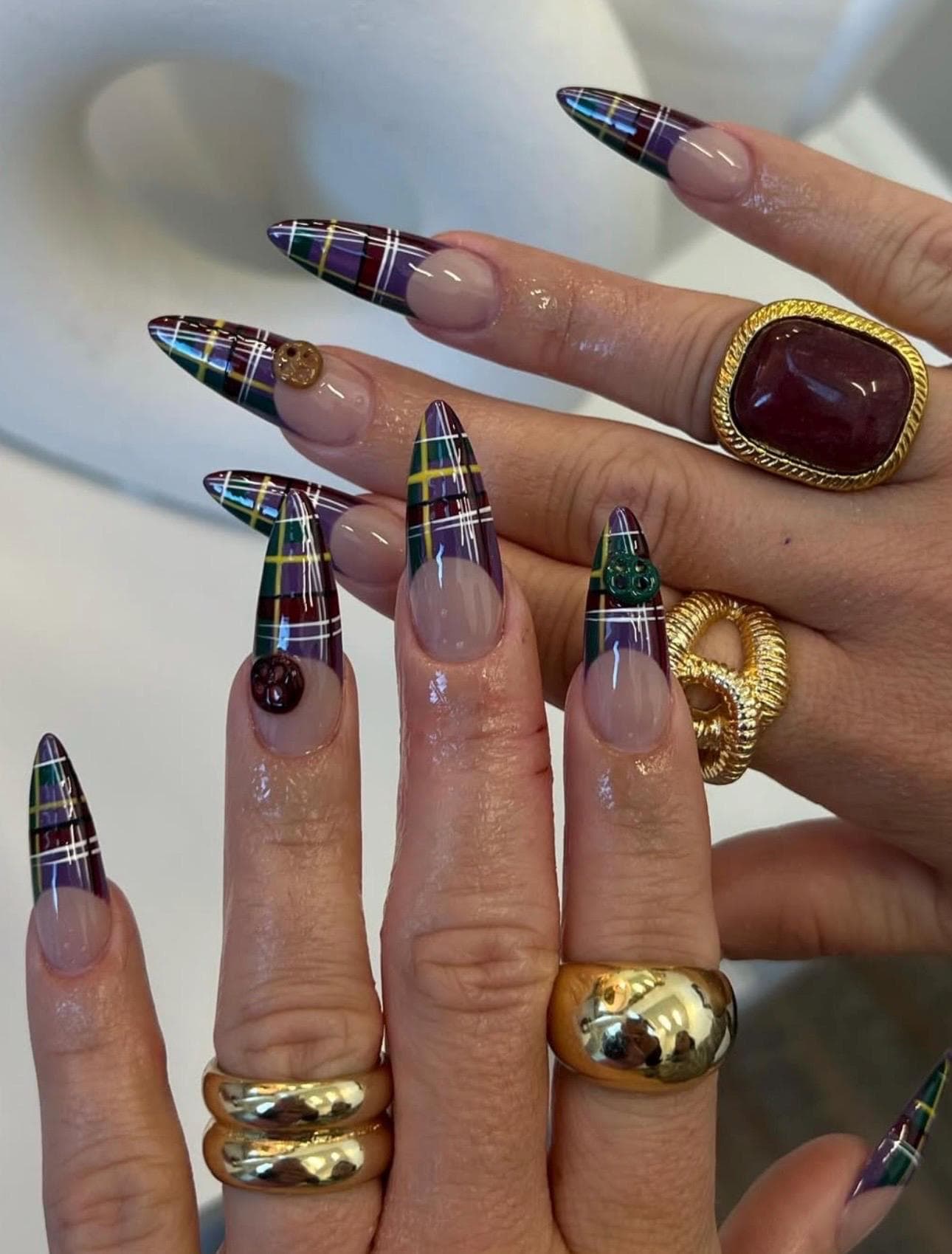 This handcrafted stiletto set features rich plaid patterns, nude base tones, and elegant gold details, creating a bold yet timeless look.