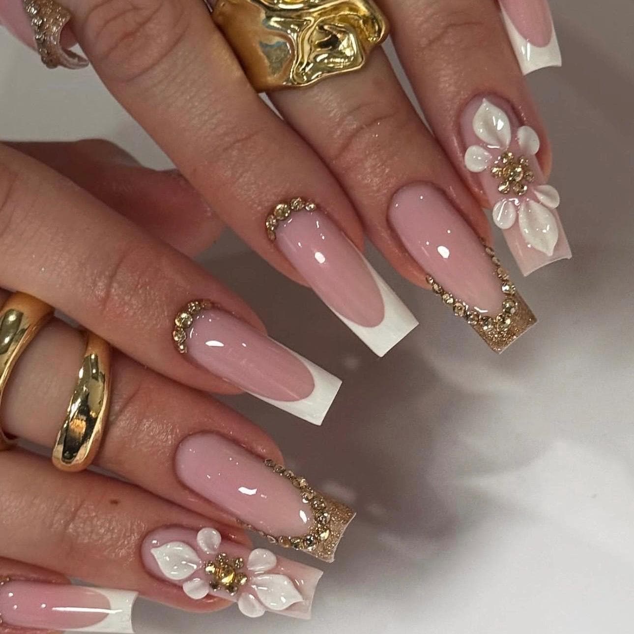 Featuring delicate 3D white flowers with gold crystal centers, curved rhinestone accents, and subtle gold glitter detailing, this set blends classic French elegance with modern luxury.