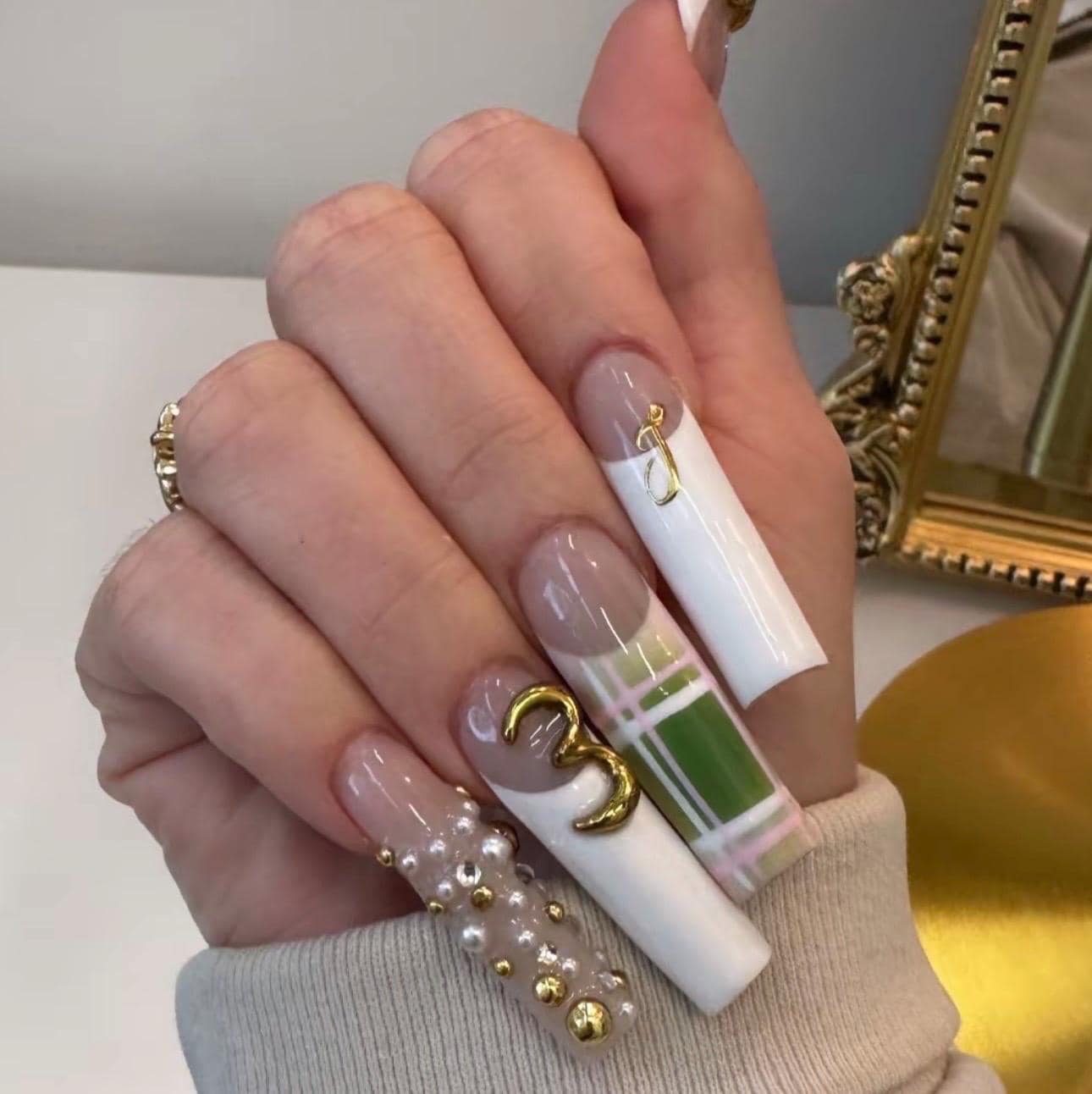 This luxury birthday press on nail set features a bold gold number charm, elegant white French tips, pearl embellishments, and a long coffin shape designed to make you feel like the ultimate birthday queen.